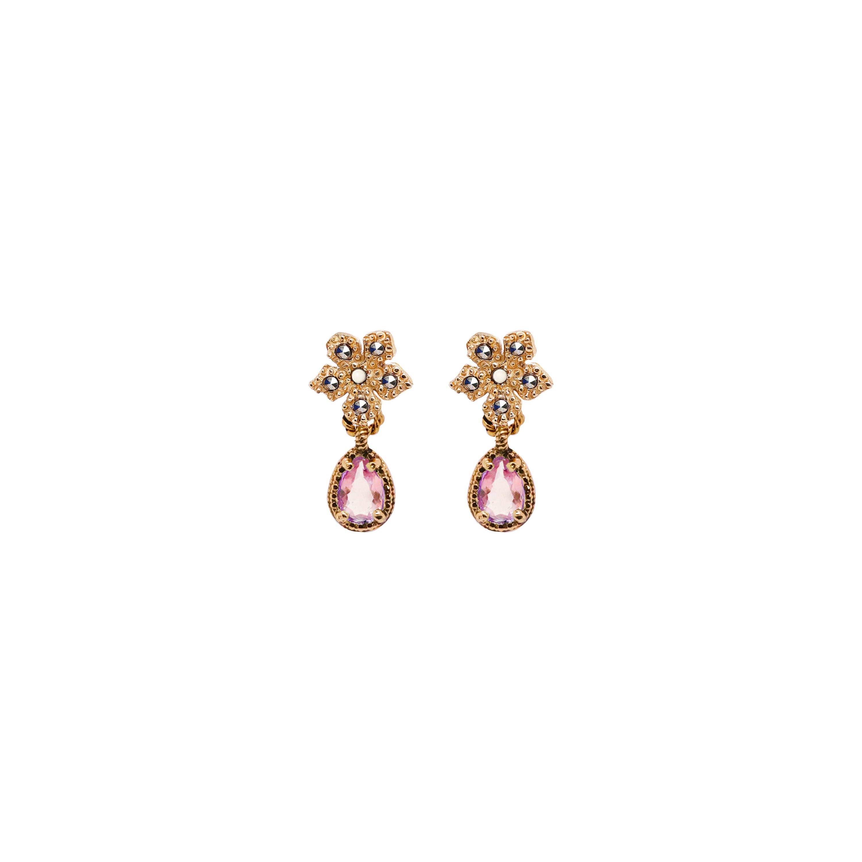 The Mini Flower Earrings with Pink Drops are the epitome of sweetness. Made of .925 sterling silver and plated with 14k gold , they combine quality, shine, and delicacy in a mini piece that steals the show.