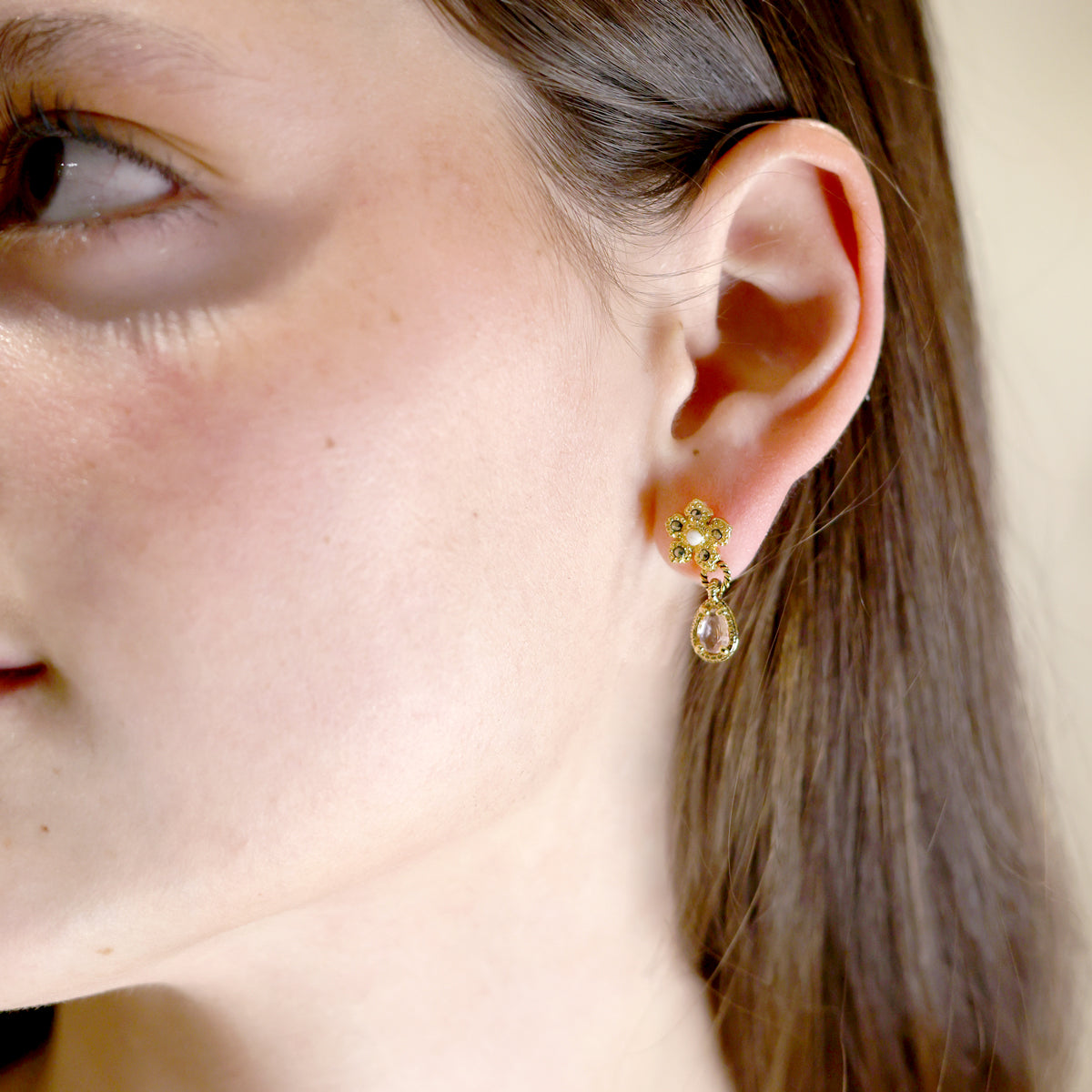 The pink drop adds a feminine and luminous touch, ideal for those who love small earrings with personality. They are ultra-lightweight and comfortable, perfect for wearing all day.