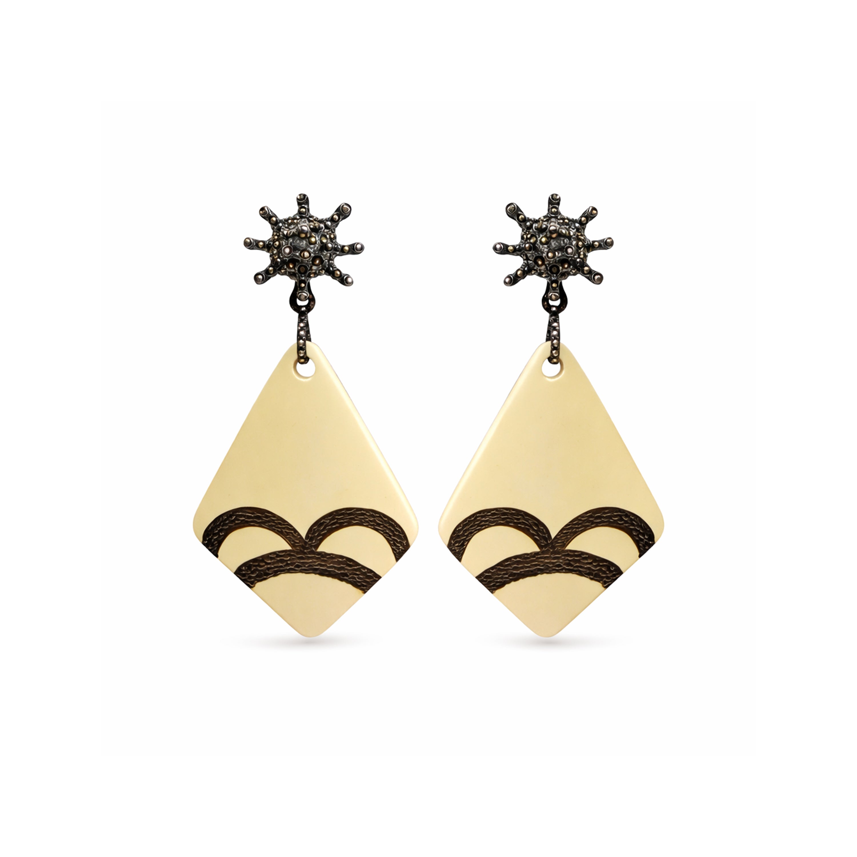 Bolynuss earring in .925 silver and grayish patina with pyrite inlays, plus zebra rhombus drop.